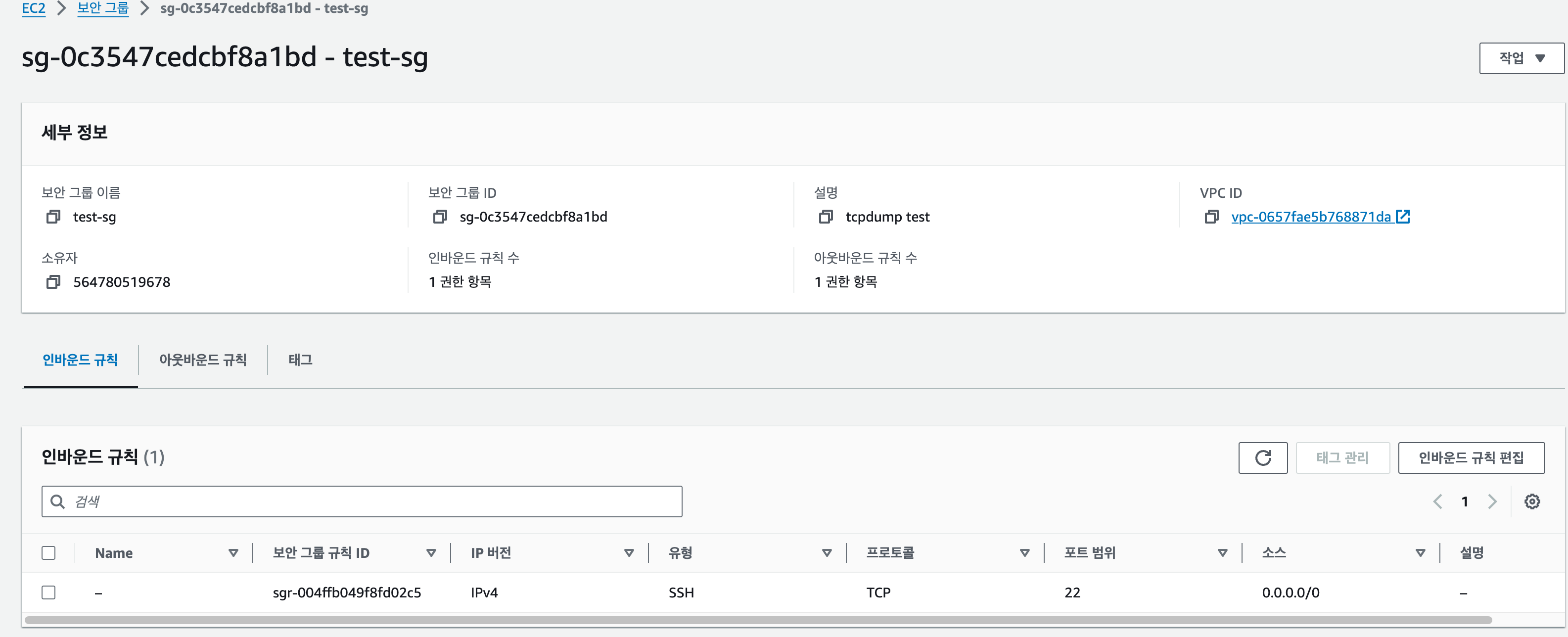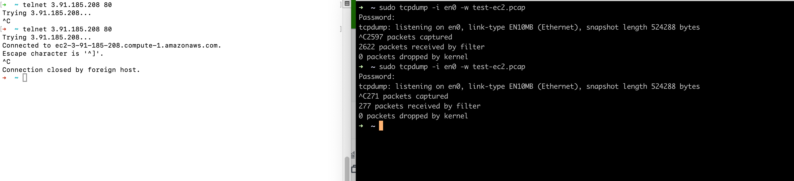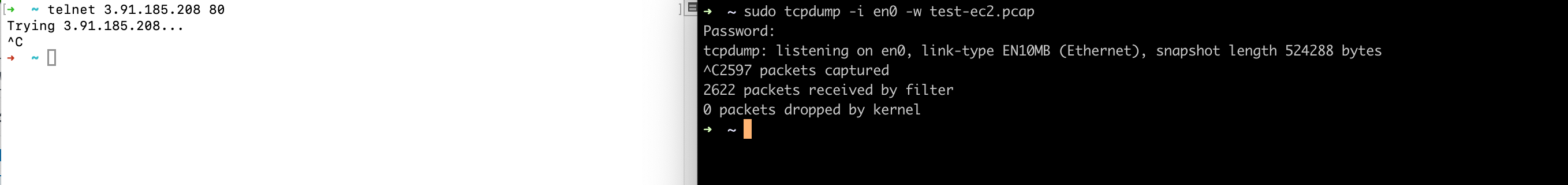 위처럼 보안 그룹을 설정하고 다시 똑같이 tcpdump 명령어를 실행하고 telnet을 실행해보면 이번에 커맨드 창에서 Connected가 됐다는 것을 확인할 수 있다.