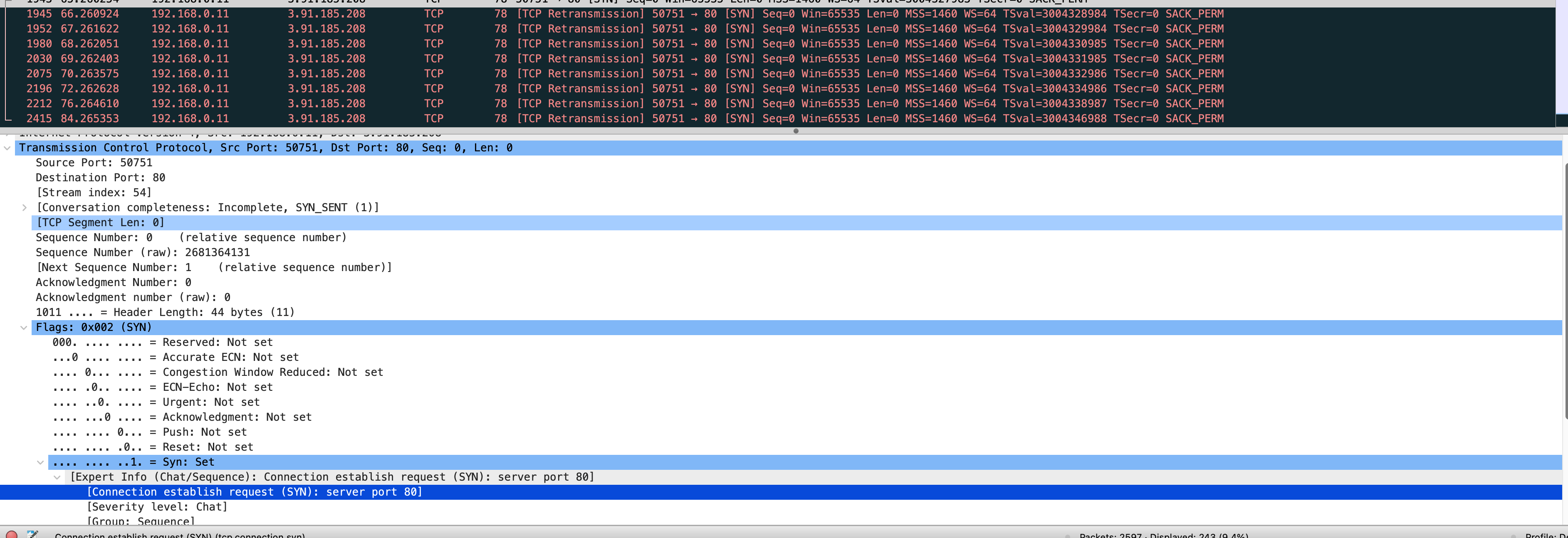 좀 더 아래로 내려보면 내가 telnet으로 80번 포트에 대한 요청을 보냈던 패킷의 내용을 볼 수 있다. 아래처럼 계속 재전송 요청이 되고 있고 seq number가 초기의 0값으로 계속 보내고 있다는 것을 미루어 보아 나의 요청이 막히고 있다는 것을 알 수 있다.