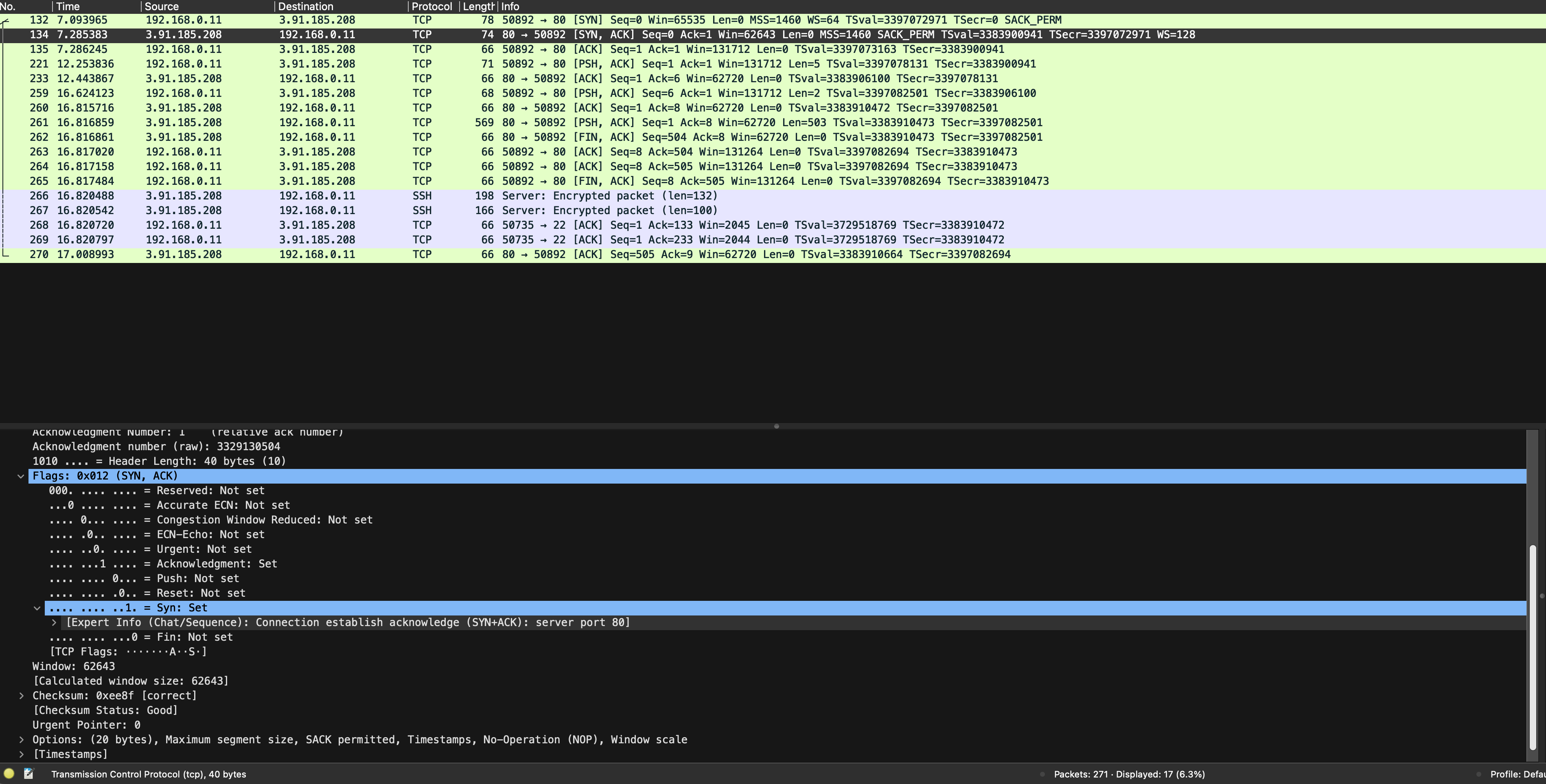 wireshark로 해당 패킷 파일을 확인해보면 아래처럼 EC2서버로부터 SYN와 ACK를 받았다는 것을 알 수 있다. 이는 내가 telnet으로 연결 설정에 성공했다는 것을 의미하며 이는 더이상 나의 패킷이 loss되지 않았다는 것을 알 수 있다.