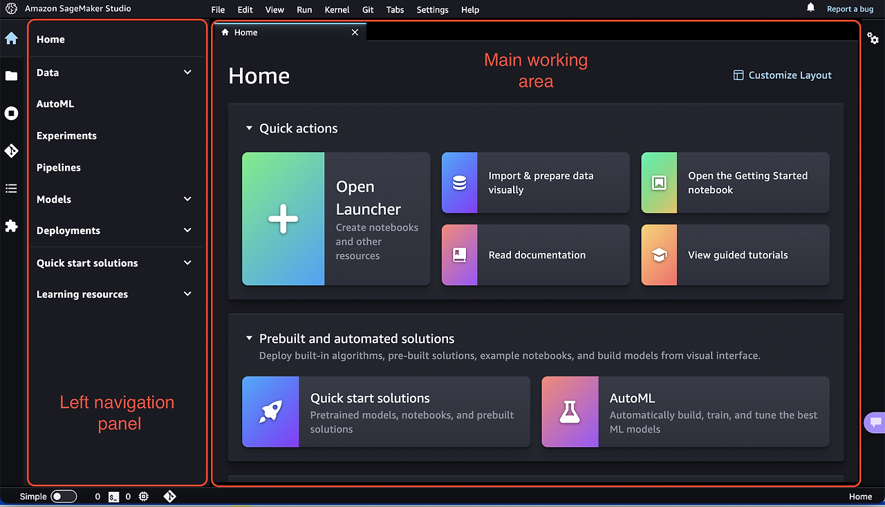 Amazon SageMaker Studio Classic은 사실 앞서 설명한 Studio와 크게 다르지 않다. 단지 예전 버전이어서 현재 Studio보다는 기능이 조금 덜 들어가 있는 수준이다. 마찬가지로 Studio Classic에서도 Jupyter 노트북을 활용하여 데이터 준비부터 학습, 배포까지 관리할 수 있다. 기존에 사용하고 있던 사용자들은 Studio Classic을 사용할 수 있지만 공식 문서에 마이그레이션과 참고에 안내를 한 것처럼 지원 범위가 좁혀지고 있기 때문에 새로운 사용자는 Studio를 활용하는 방법이 더 나은 선택일 수도 있다.